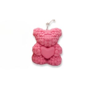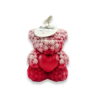 100% plant-based rapeseed wax with a cotton wick in a teddy bear shape, holding roses and a heart.
