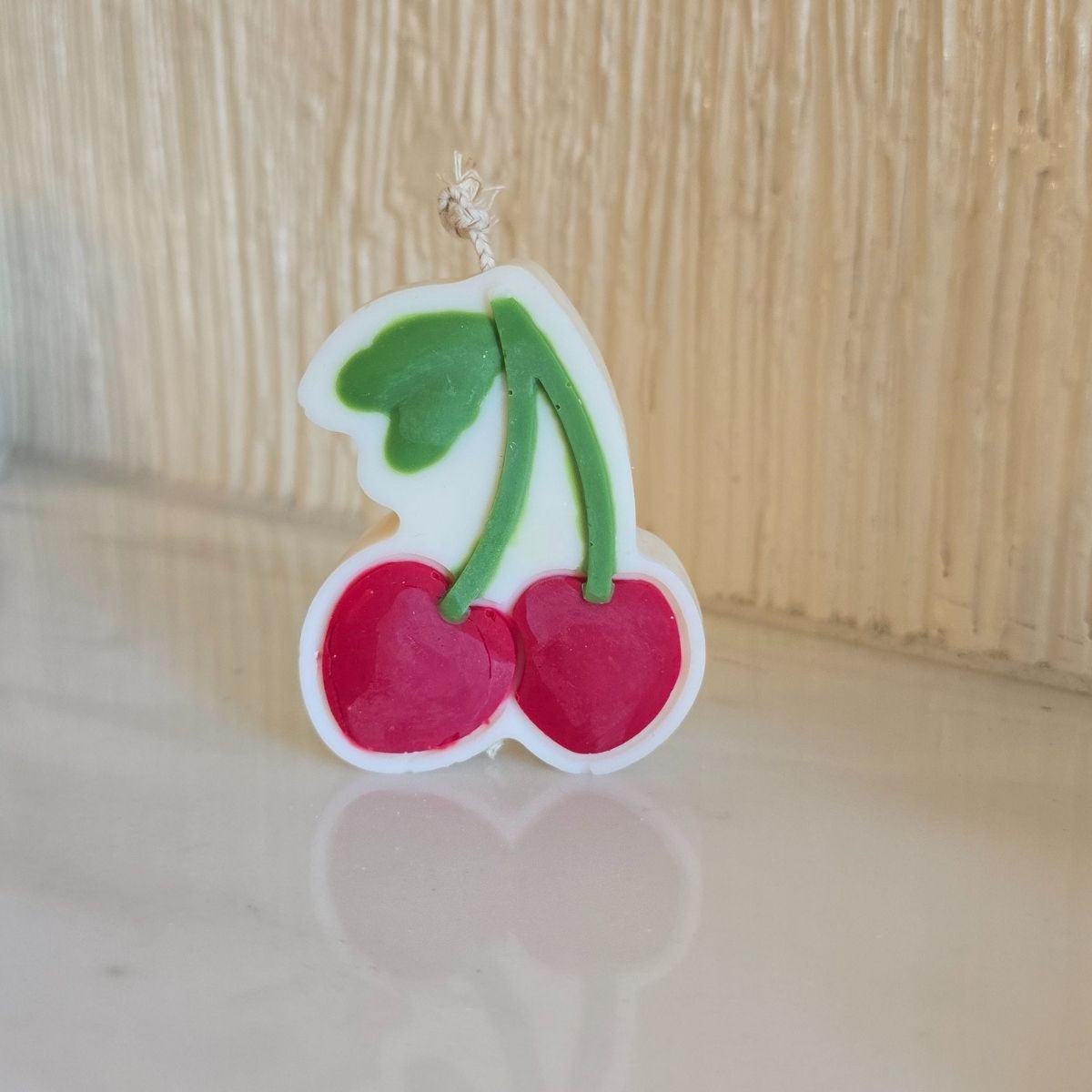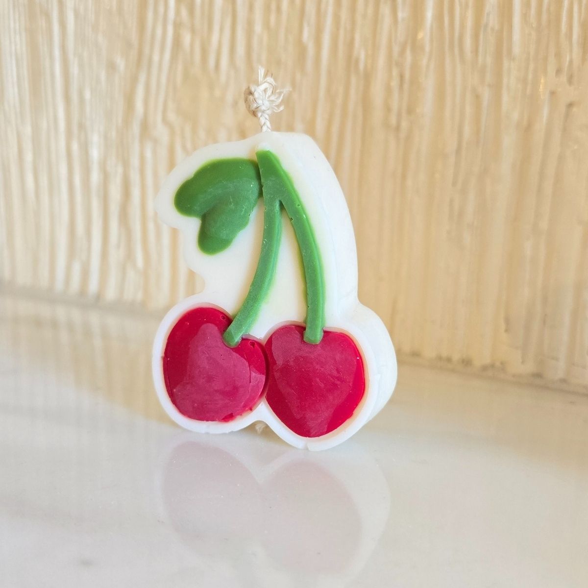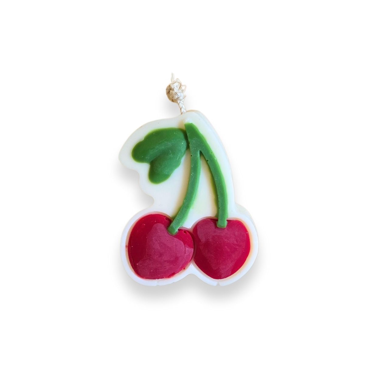 100% plant-based rapeseed wax with a cotton wick, cherry-shaped with a Sour Cherry scent.
