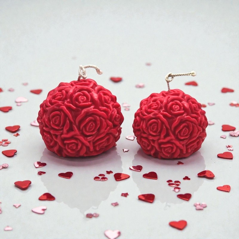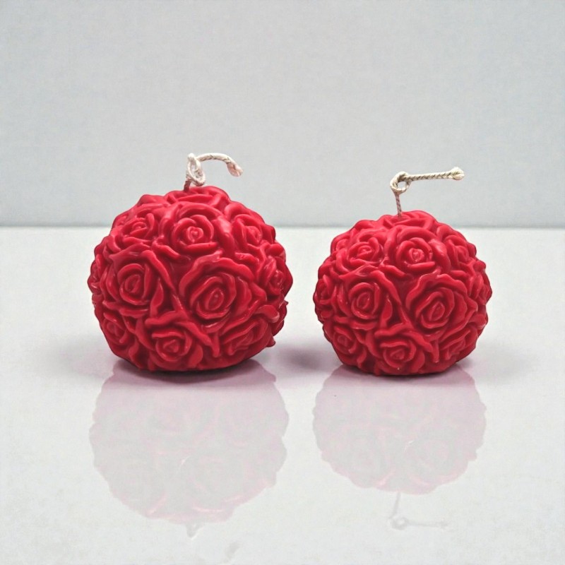 100% Φυτικό κόκκινο κερί ελαιοκράμβης με βαμβακερό φυτίλι σε σχήμα μπάλας με τριαντάφυλλα σε μικρό ή μεσαίο μέγεθος, με άρωμα Μήλο-Κανέλα.