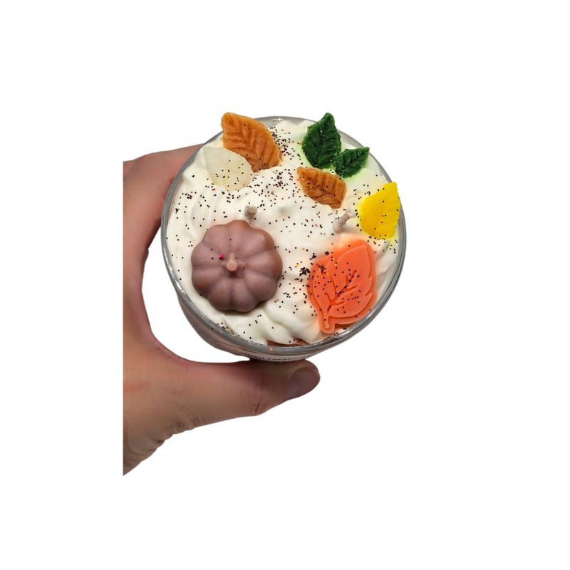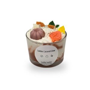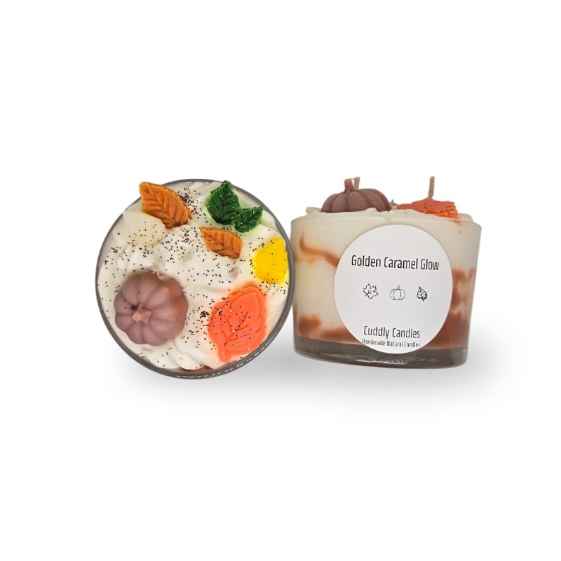 100% Natural Soy Wax Candle with two cotton wicks, presented in a low glass jar. Decorated with two-tone whipped topping, autumn-inspired wax melts, glitter, and infused with the indulgent fragrance of Salty Caramel.