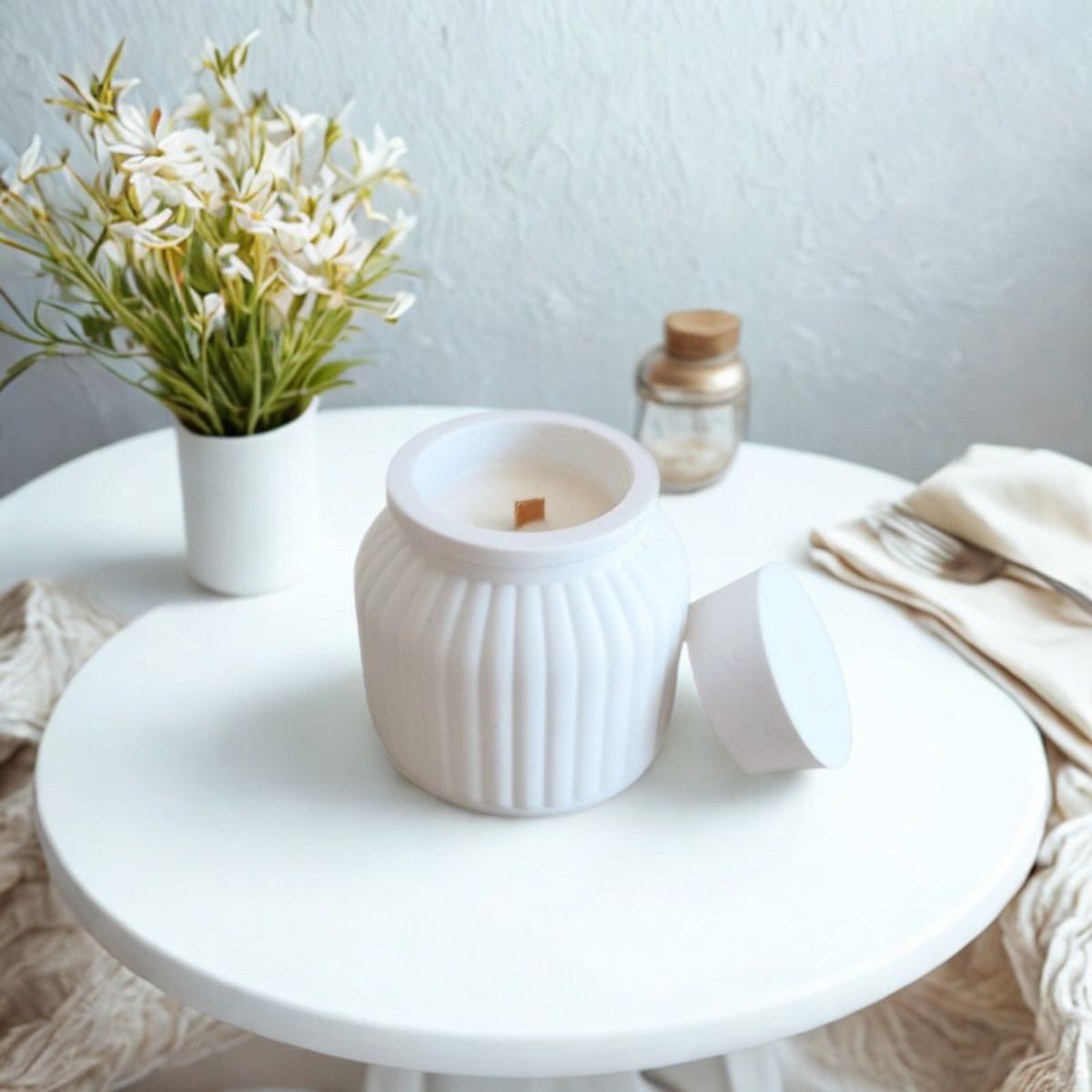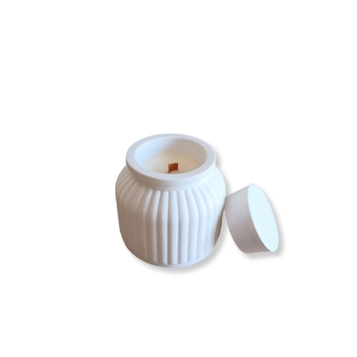 100% plant-based white soy wax with a cotton wick in a mini striped porcelain jar.
