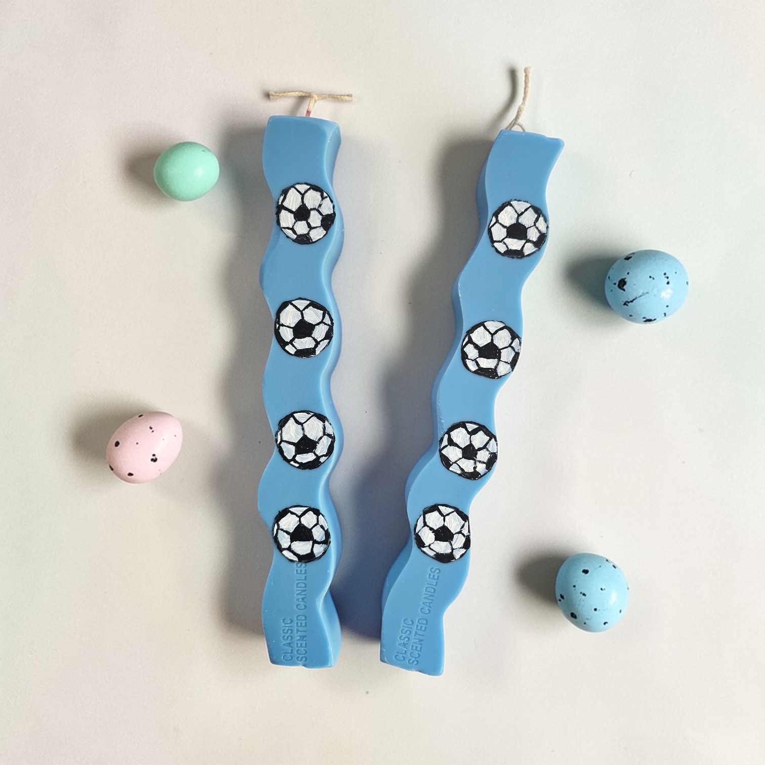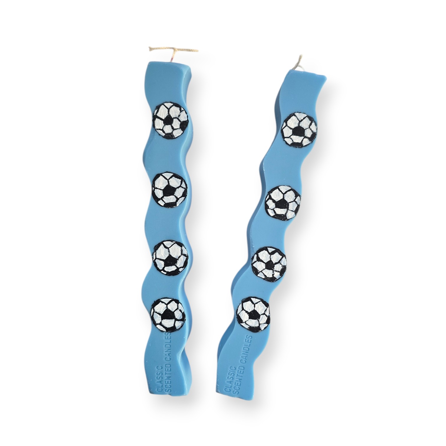 Λαμπάδα κυματιστή με 100% Φυτικό κερί ελαιοκράμβης με βαμβακερό φυτίλι, σε μπλε χρώμα, ζωγραφισμένες μπάλες ποδοσφαίρου και άρωμα Πούδρα Μωρού.