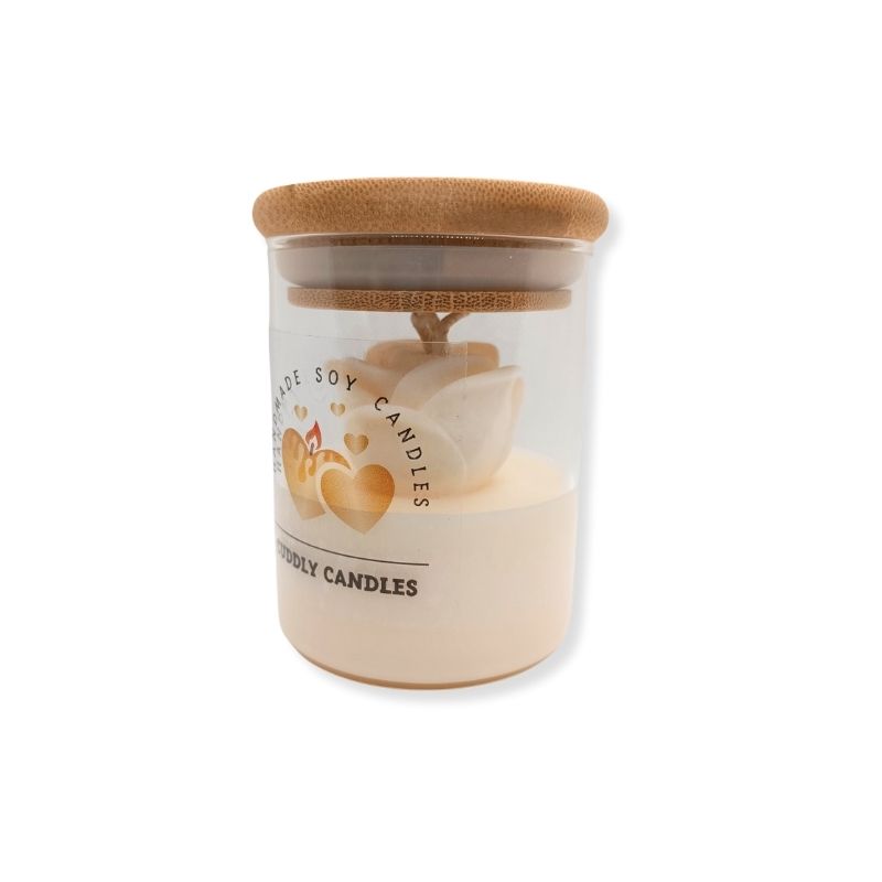 100% Φυτικό λευκό κερί σόγιας με βαμβακερό φυτίλι σε γυάλινο ποτήρι με ξύλινο καπάκι & τριαντάφυλλο.