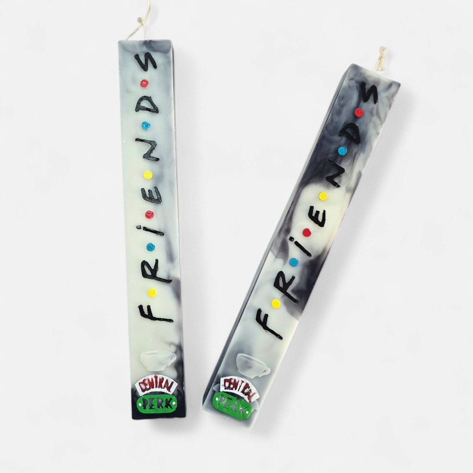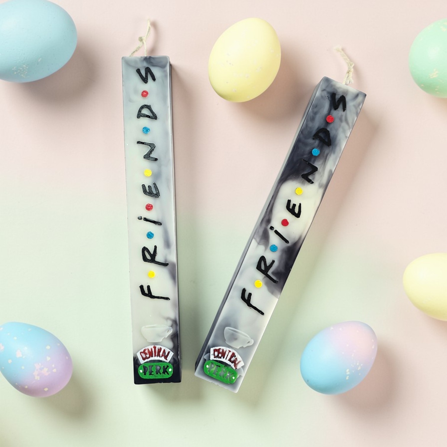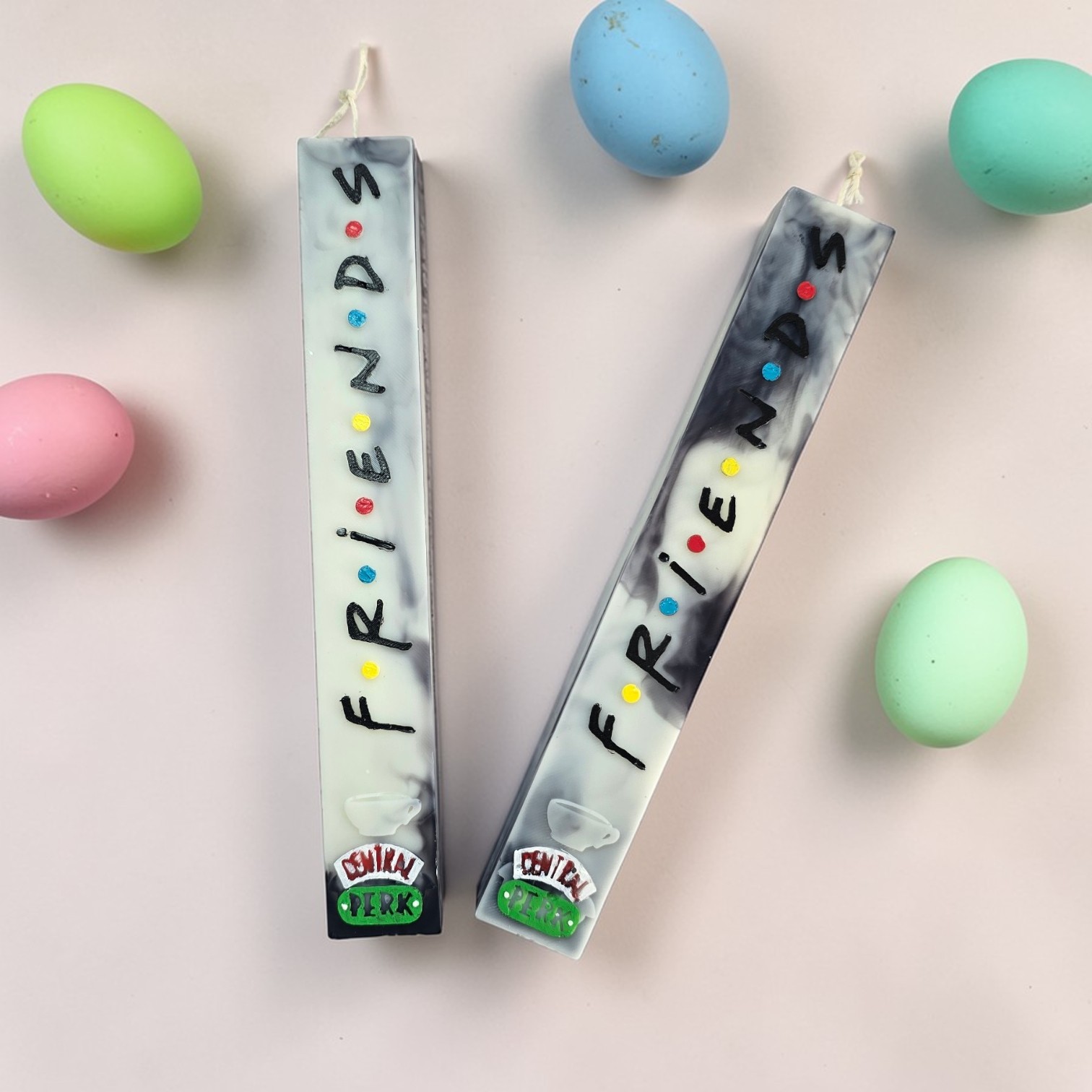 Λαμπάδα Friends με 100% Φυτικό κερί ελαιοκράμβης με βαμβακερό φυτίλι, σε χρώμα λευκό/μαύρο και άρωμα Spring Blossom, ζωγραφισμένη στο χέρι.