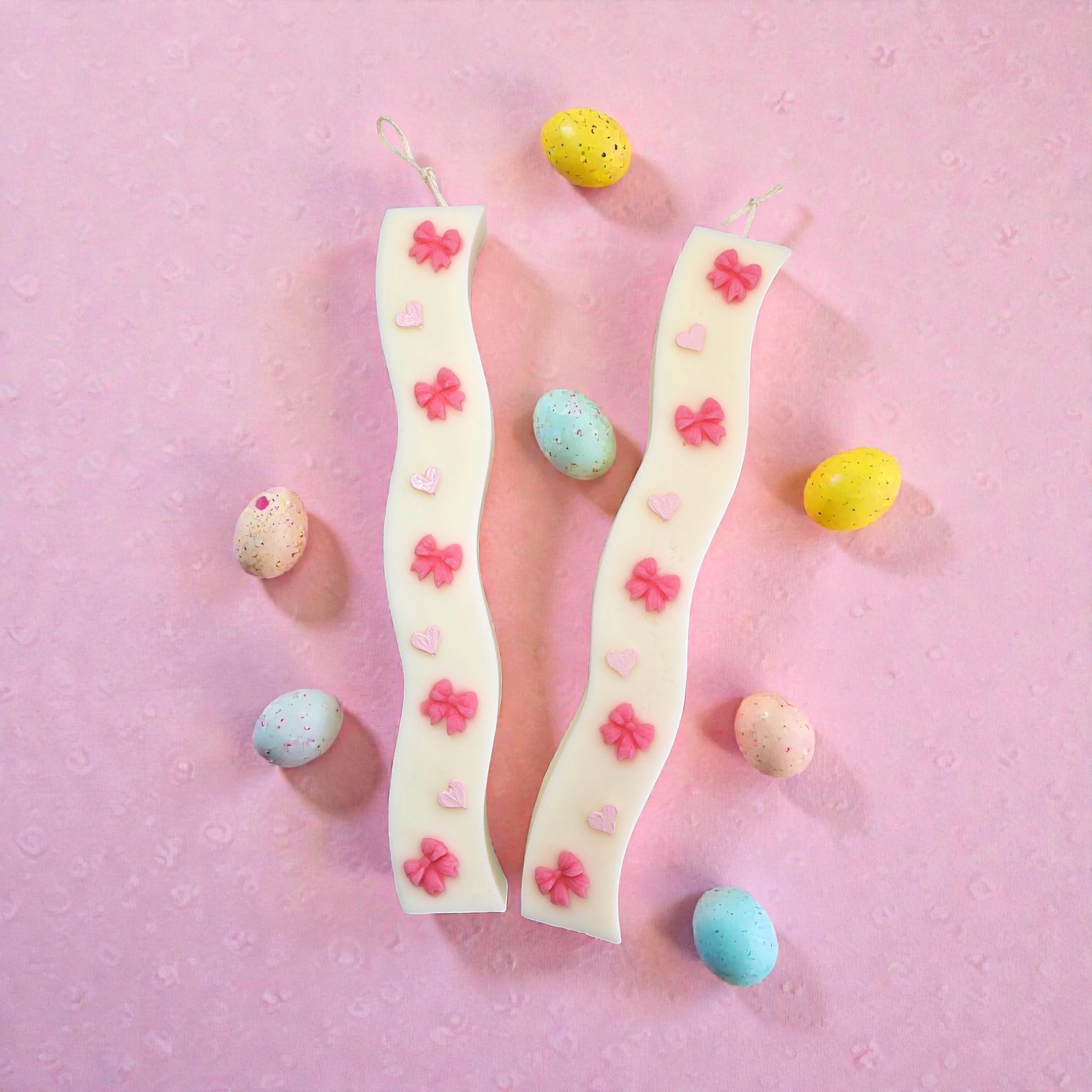 Λαμπάδα κυματιστή με ροζ φιόγκους & καρδιές με 100% Φυτικό κερί ελαιοκράμβης με βαμβακερό φυτίλι, σε χρώμα άσπρο και άρωμα Spring Blossom.