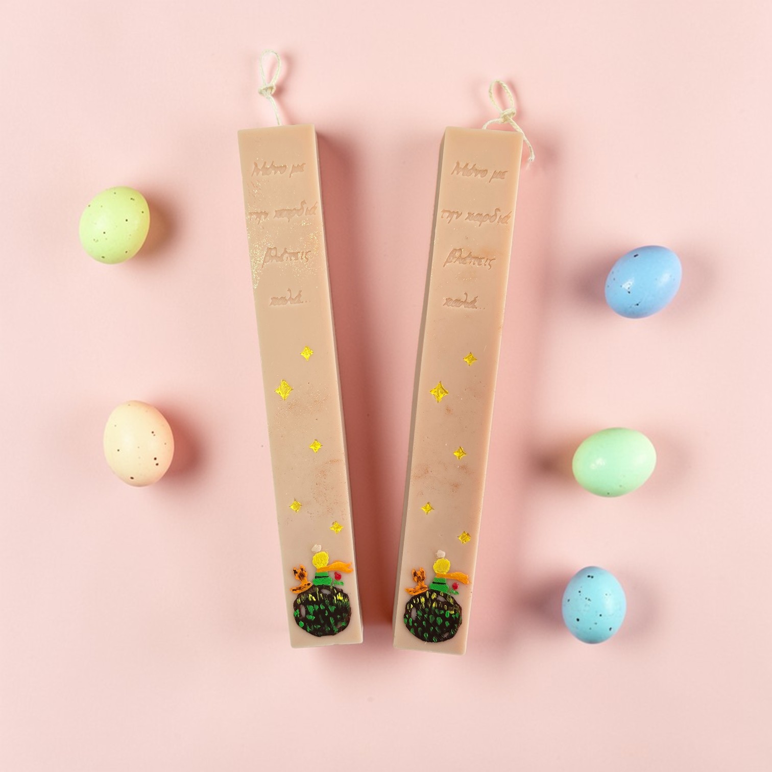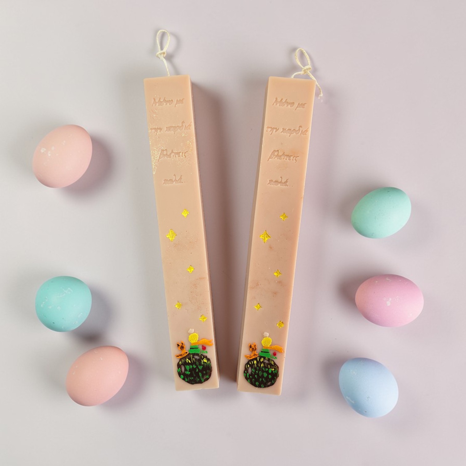 Λαμπάδα Little Prince με 100% Φυτικό κερί ελαιοκράμβης με βαμβακερό φυτίλι, σε χρώμα μπεζ και άρωμα Spring Blossom, ζωγραφισμένη στο χέρι.