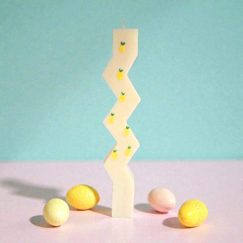 Λαμπάδα ζικ-ζακ με 100% Φυτικό λευκό κερί ελαιοκράμβης με βαμβακερό φυτίλι, ζωγραφισμένα λεμόνια και άρωμα Clean & Fresh.