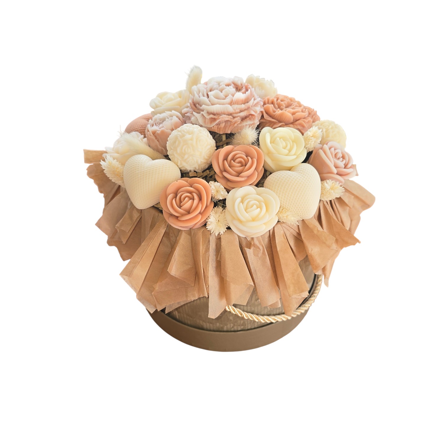 Κομψή κέρινη σύνθεση σε ροζ κασπώ, από 100% φυτικό κερί ελαιοκράμβης, με απαλά λευκά και μπεζ άνθη που προσθέτουν ρομαντική και ζεστή πινελιά σε κάθε χώρο.