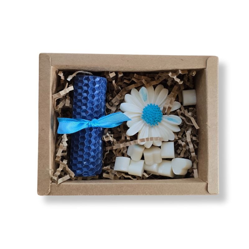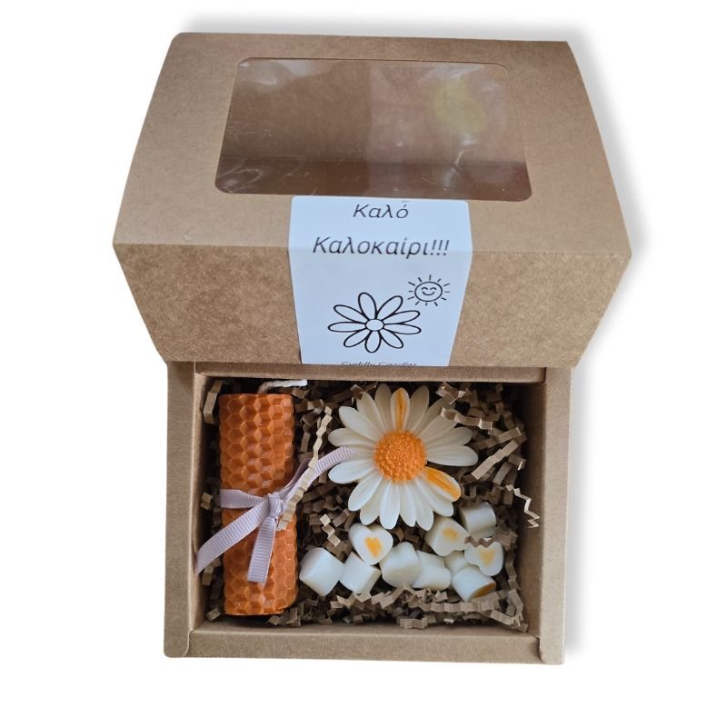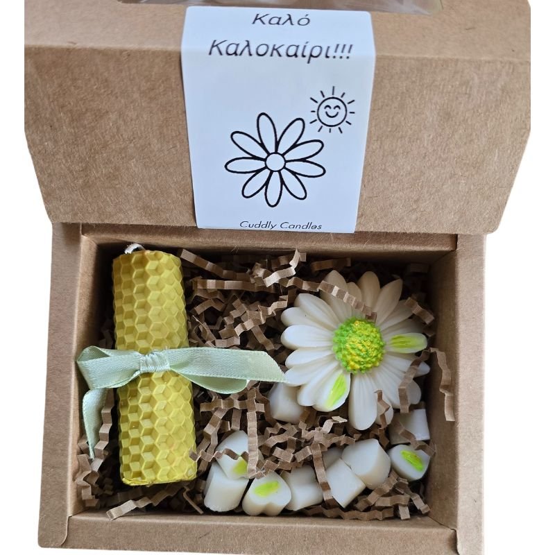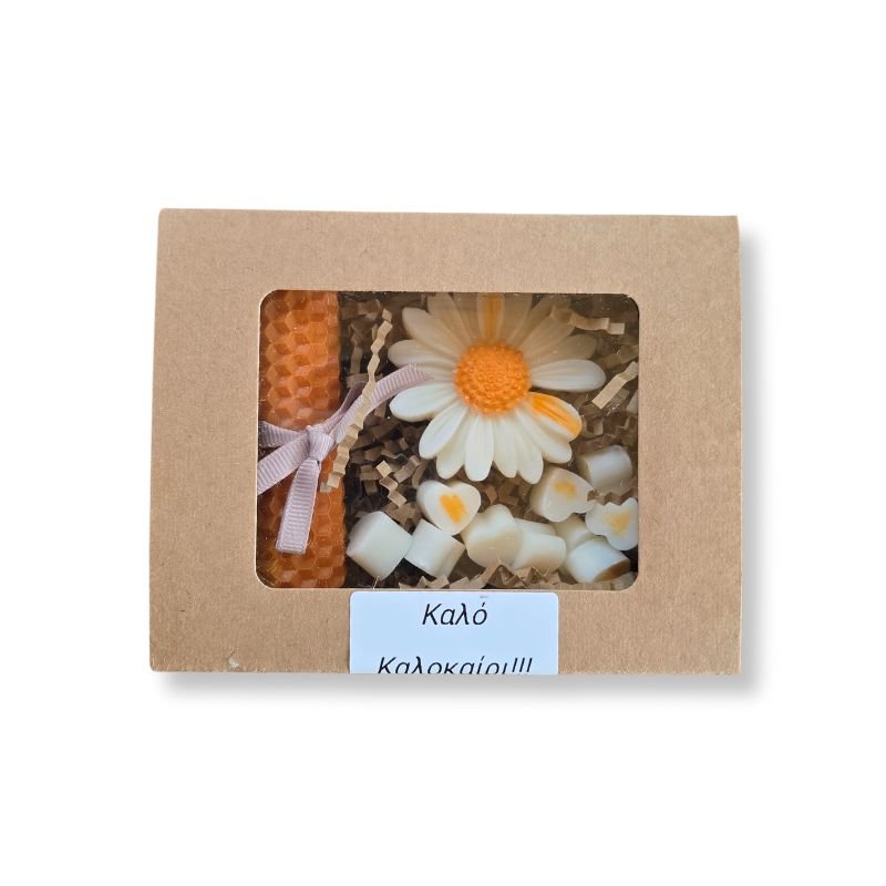 Περιέχει: 1 κερί από μελισσοκέρι και wax melts από 100% φυτικό κερί ελαιοκράμβης, 1 μαργαρίτα και 10 mini καρδούλες.