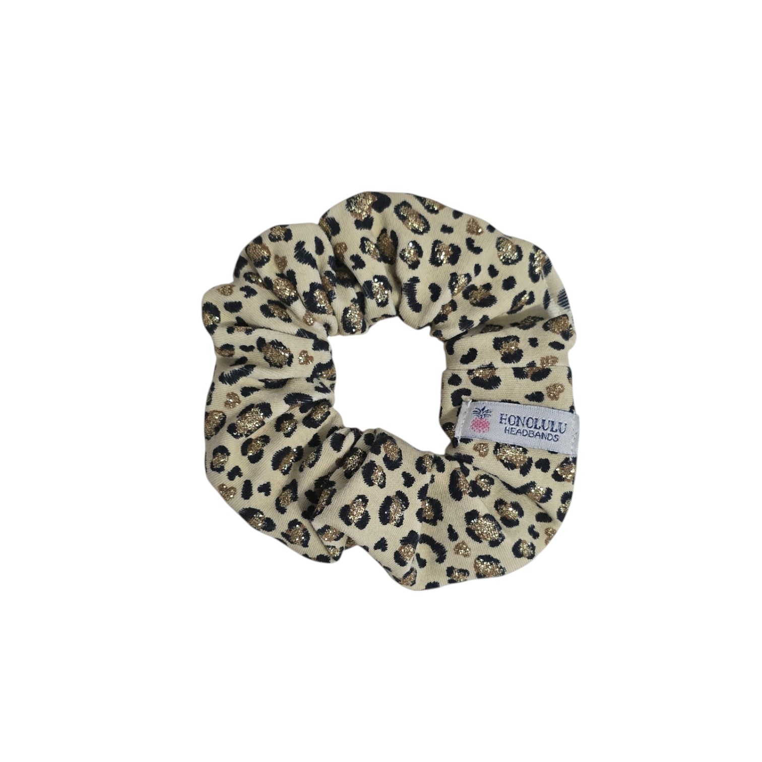 Scrunchie λεοπάρ μπεζ με χρυσές λεπτομέρειες.